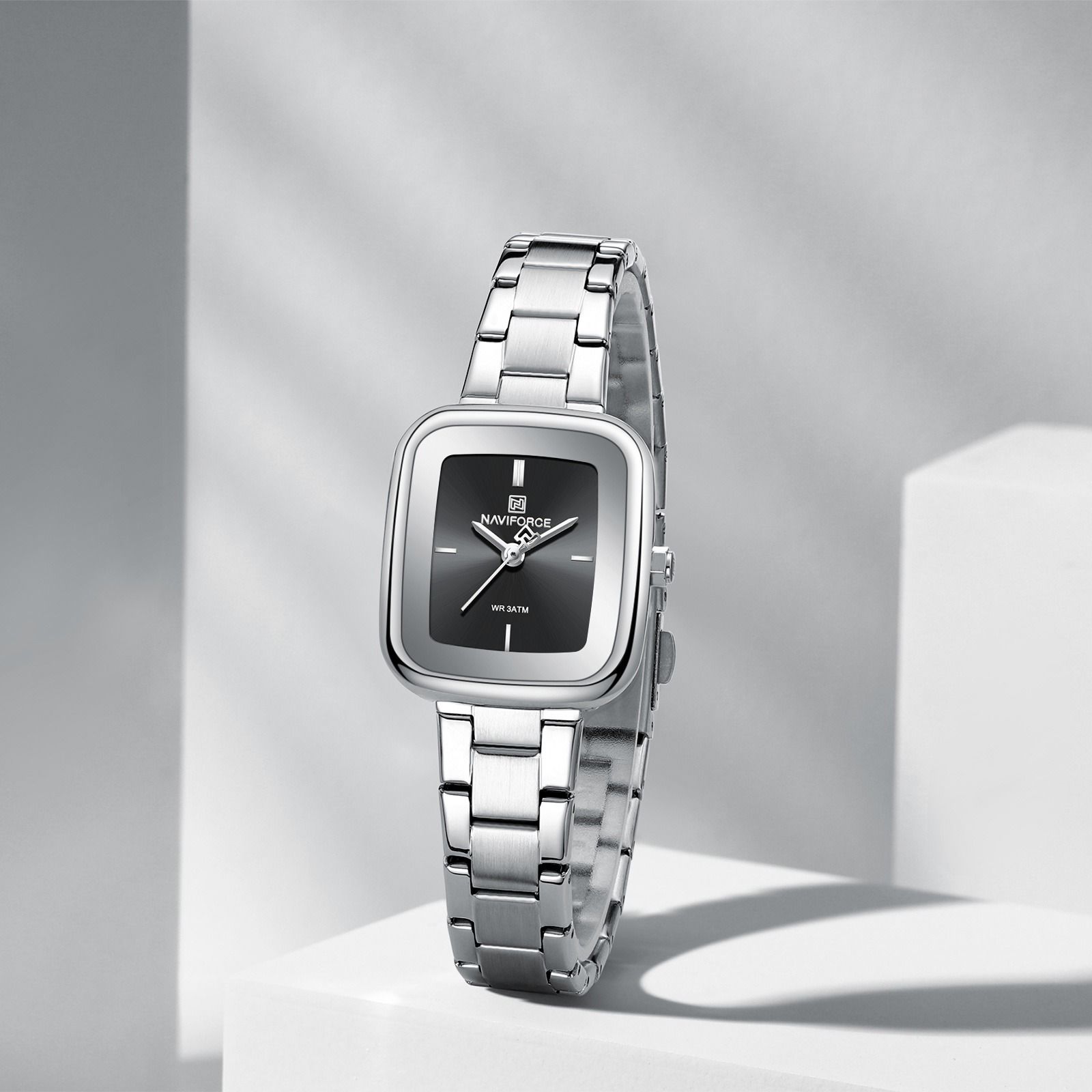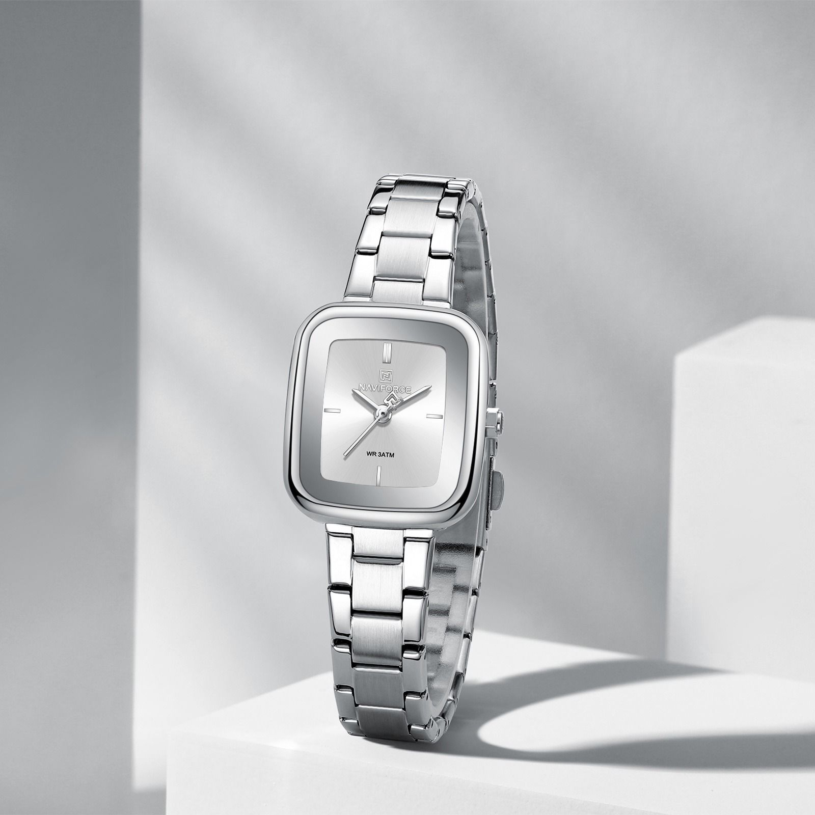 ساعت مچی زنانه Naviforce مدل NF5075 | بند استیل نقره ای صفحه سفید مینیمال